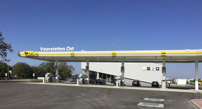 Neubau einer Raststätte mit Tankstelle, Tankdach, Wirtschaftshof, Parkflächen.