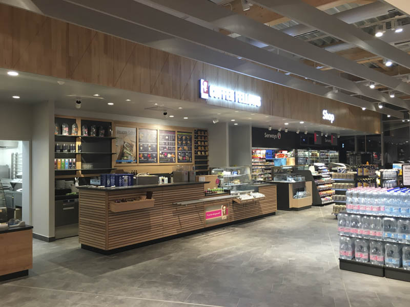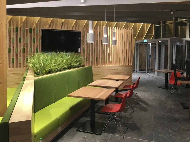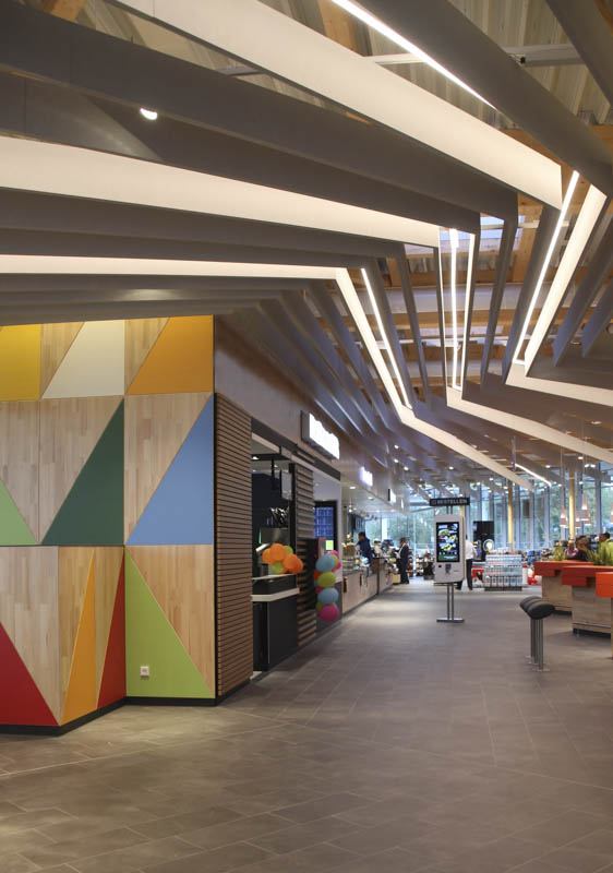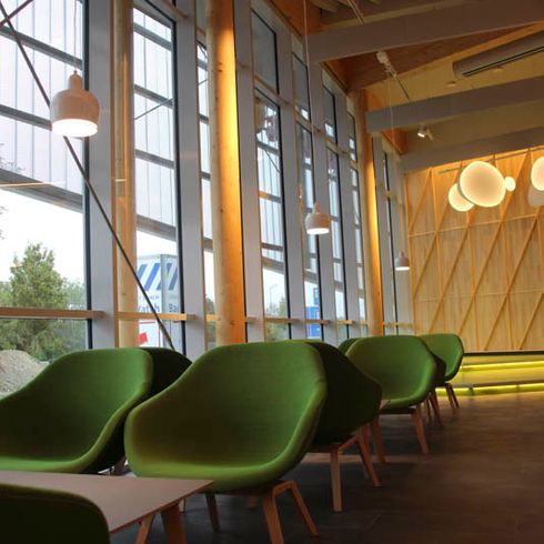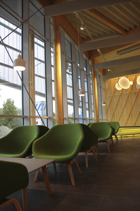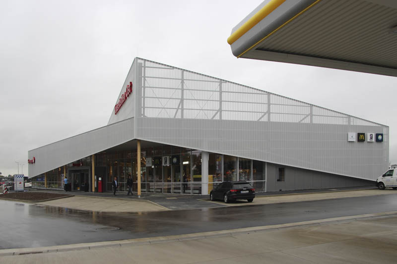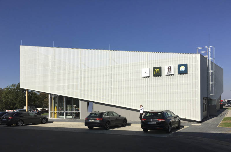 Neubau einer modernen Raststätte Vaterstetten Ost mit moderner Fassadengestaltung aus Streckmetall und Holz. Anlage mit ca. 120 Sitzplätzen und Systemgastronomie McDonald's, dean&david und Coffee Fellows.