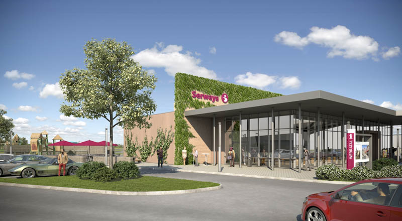 Neubau einer Raststätte mit Tankstelle, Tankdach, Wirtschaftshof, Parkflächen.