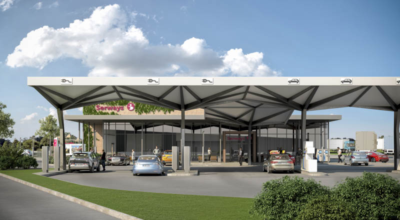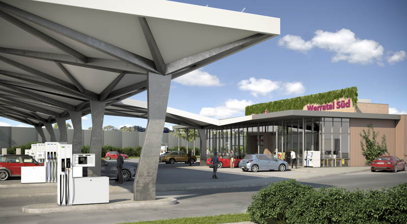 Die Neuerrichtung der Tank- und Rastanlage Werratal Süd weist mit dem gleichberechtigten Angebot von Ladestationen für Elektroautos neben Zapfsäulen für klassische Kraftstoffe unter einem Dach eine Neuheit im Netz der deutschen Autobahn auf. Die Gebäudegeometrie ist in Anlehnung an die Umgebung mit Sandstein und Holz, sowie einer Begrünung der Fassade gestaltet.